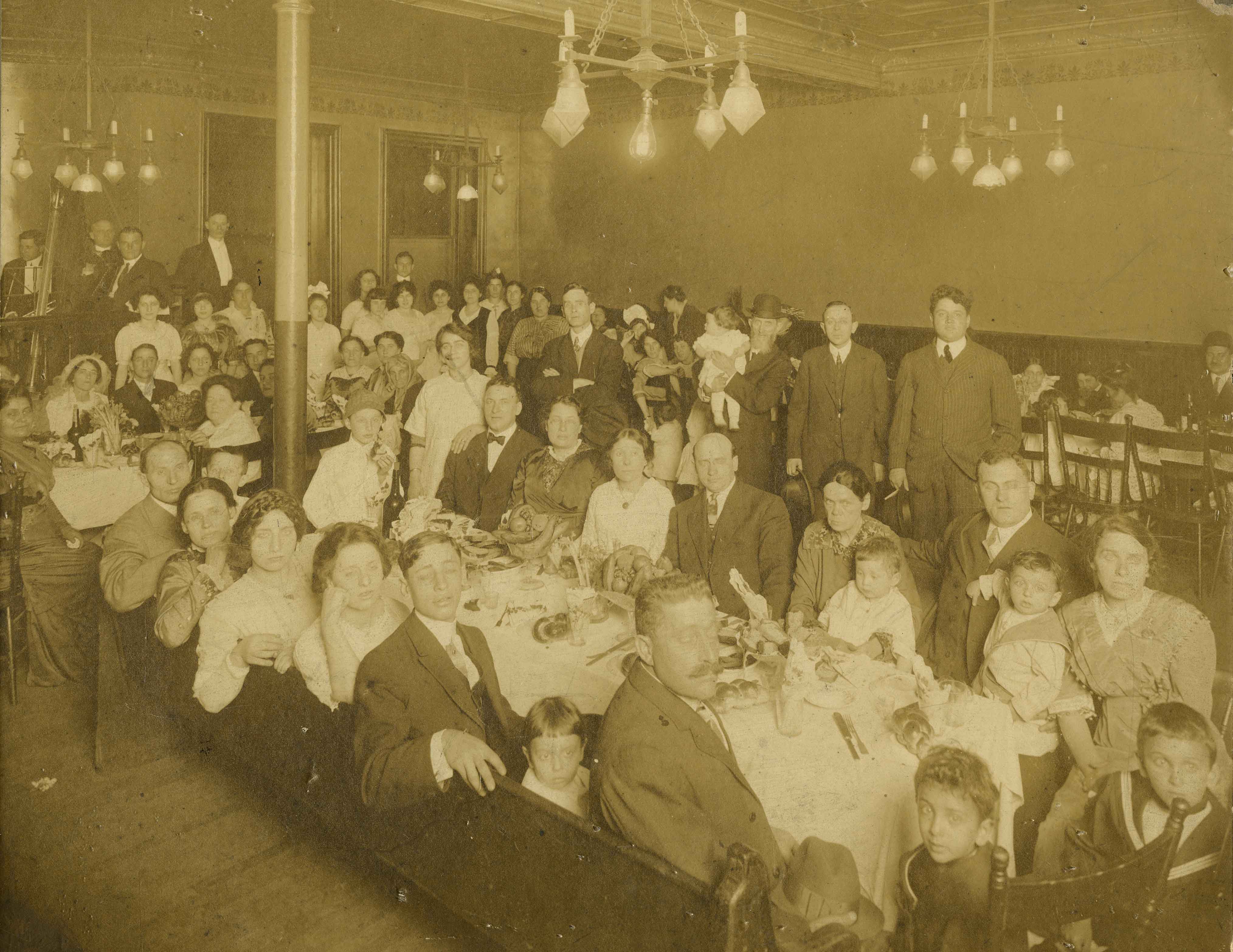 Morris Levine and Anna Robbins (seated at head table, far left) at their wedding dinner. Date July 1913 Identifier 20050227_F001_I01 Collection Morris Levine Collection Source Rauh Jewish Archives at the Heinz History Center Family The Levine Family : View Family Member