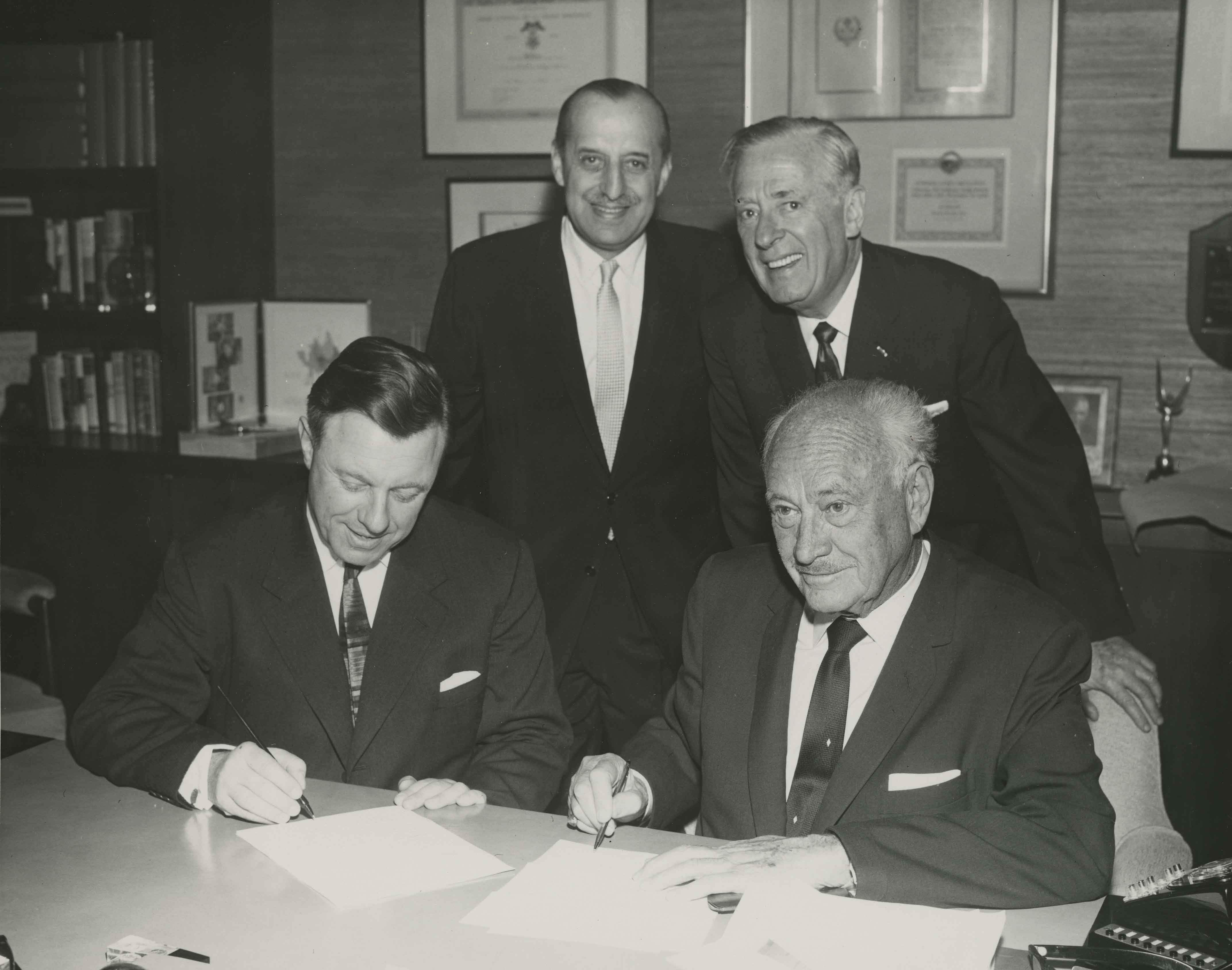 The hotelier Conrad Hilton (seated right) and Nathaniel Kann (standing left) signing papers related to the construction of the Tel Aviv Hilton.
