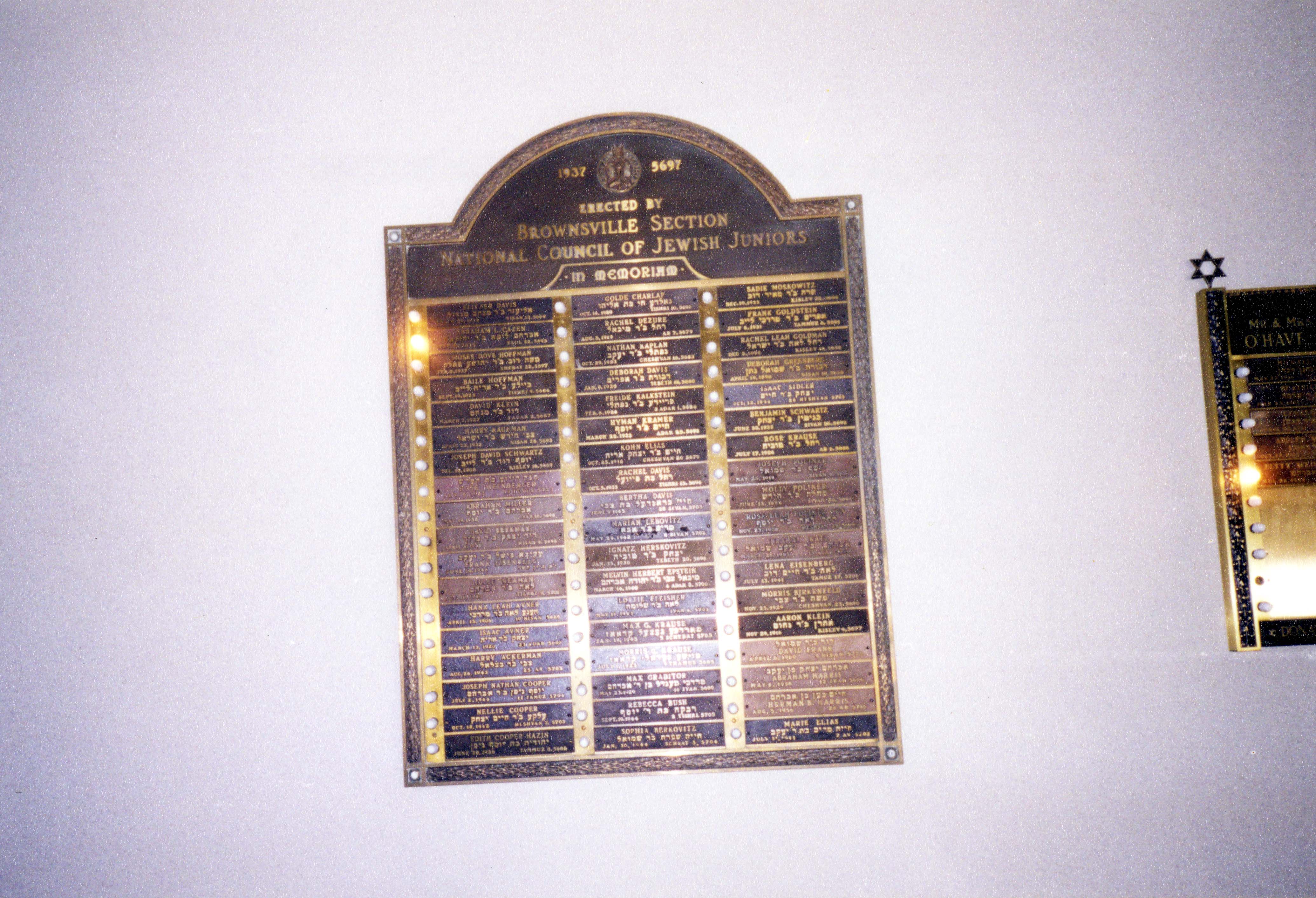 The Brownsville Section of the National Council of Jewish Juniors donated a memorial plaque for Congregation Ohave Israel in 1937. The plaque was later relocated to Beth El Congregation of the South Hills.
