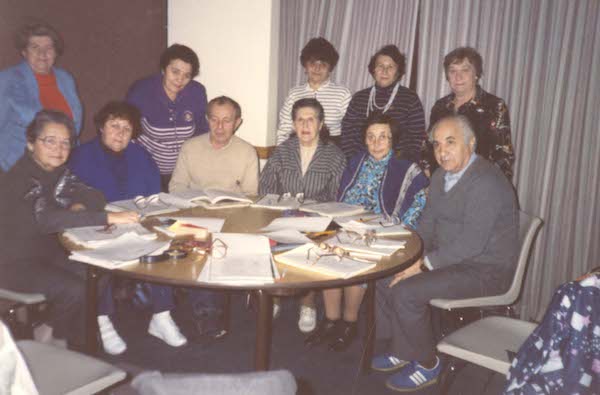 Color photograph showing 11 people sitting and standing around a table during an English as a Second Language class at the Jewish Community Center in Squirrel Hill.