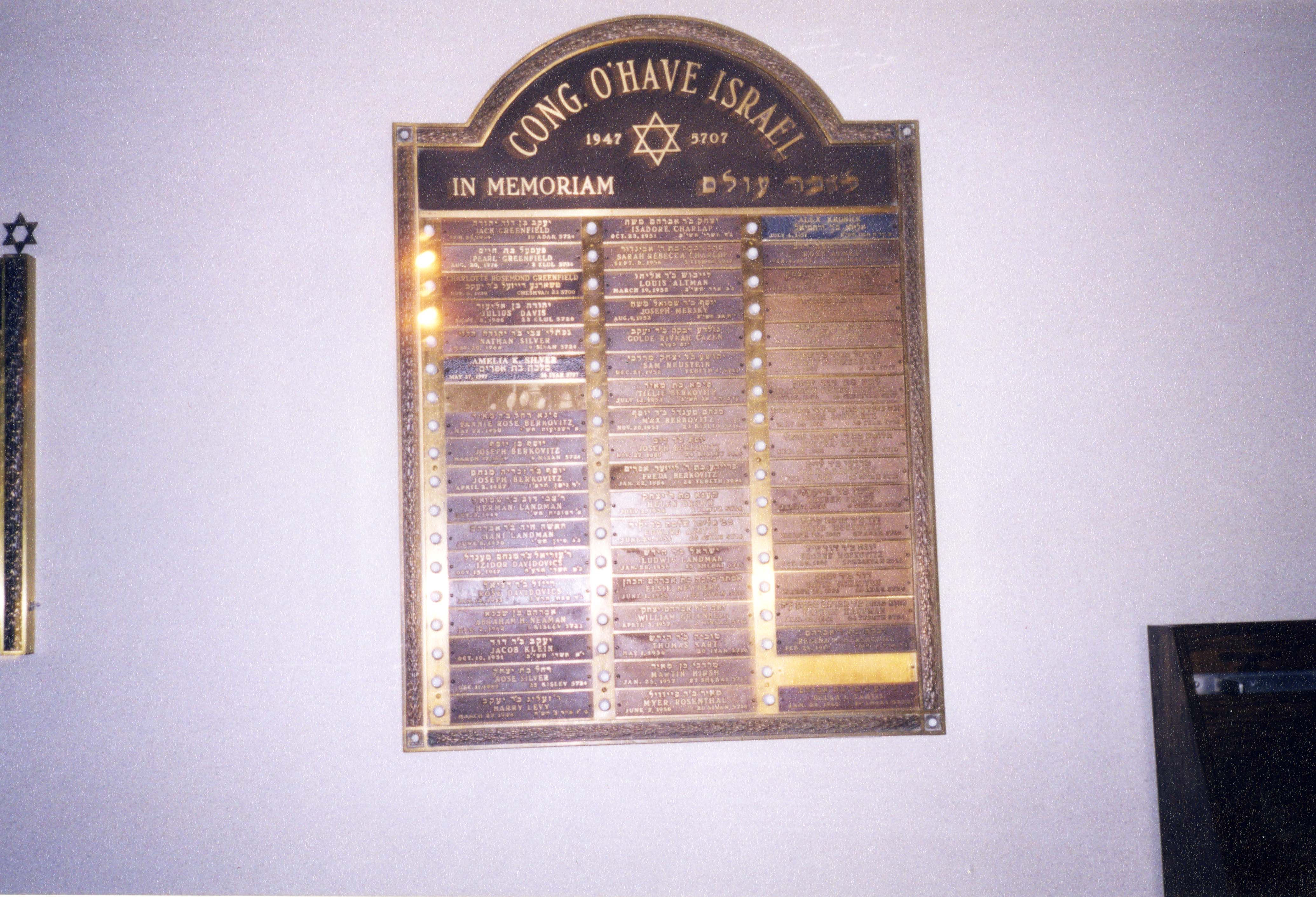 One of the memorial plaques of Congregation Ohave Israel of Brownsville, Pa., at its new location at Beth El Congregation of the South Hills.