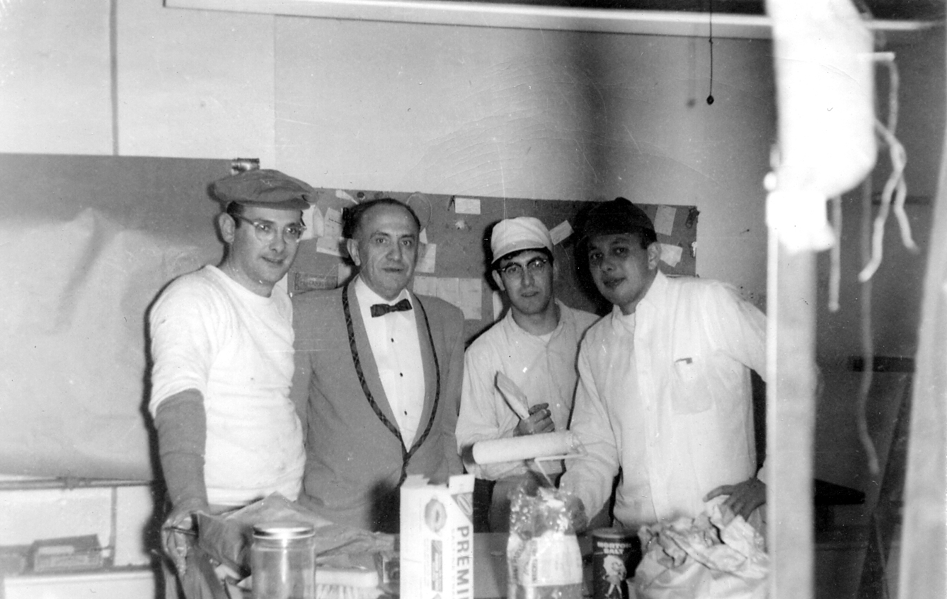 Gerson Brothers co-owner Sam Gerson (in suit) pauses for a photograph with his nephews Alan Gerson (far left) and Danny Greenspan (far right) and his employee Gino De Iuliis. Alan Gerson later owned the South Side dry cleaners. De Iuliis opened the New Oakland Tailor on Meyran Street in Oakland in 1961.