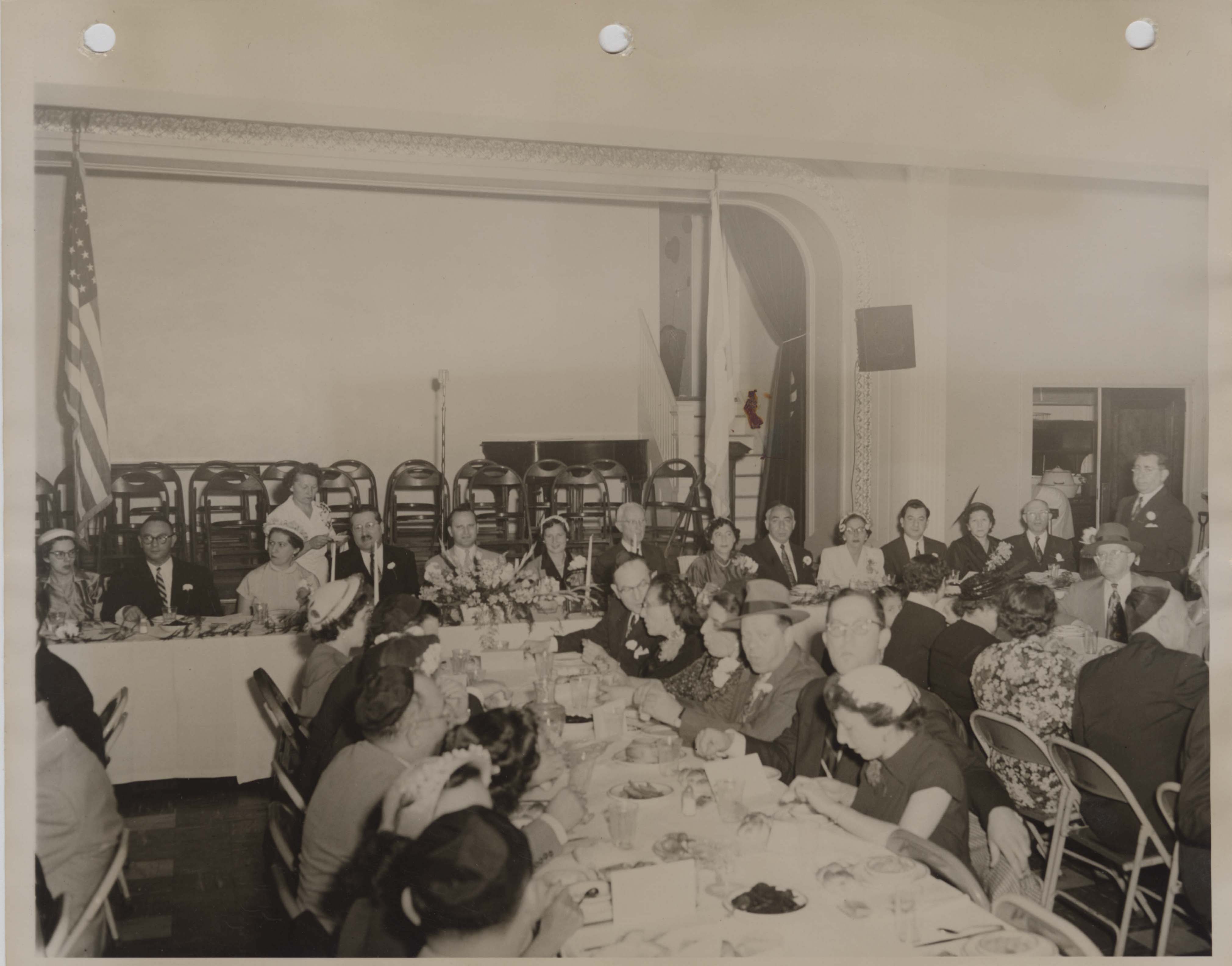 Black and white photograph of Rabbi Joseph Shapiro (seated, fourth from left) and members of the Poale Zedeck Men’s Club at an unidentified event in the social hall of Congregation Poale Zedeck in Squirrel Hill.