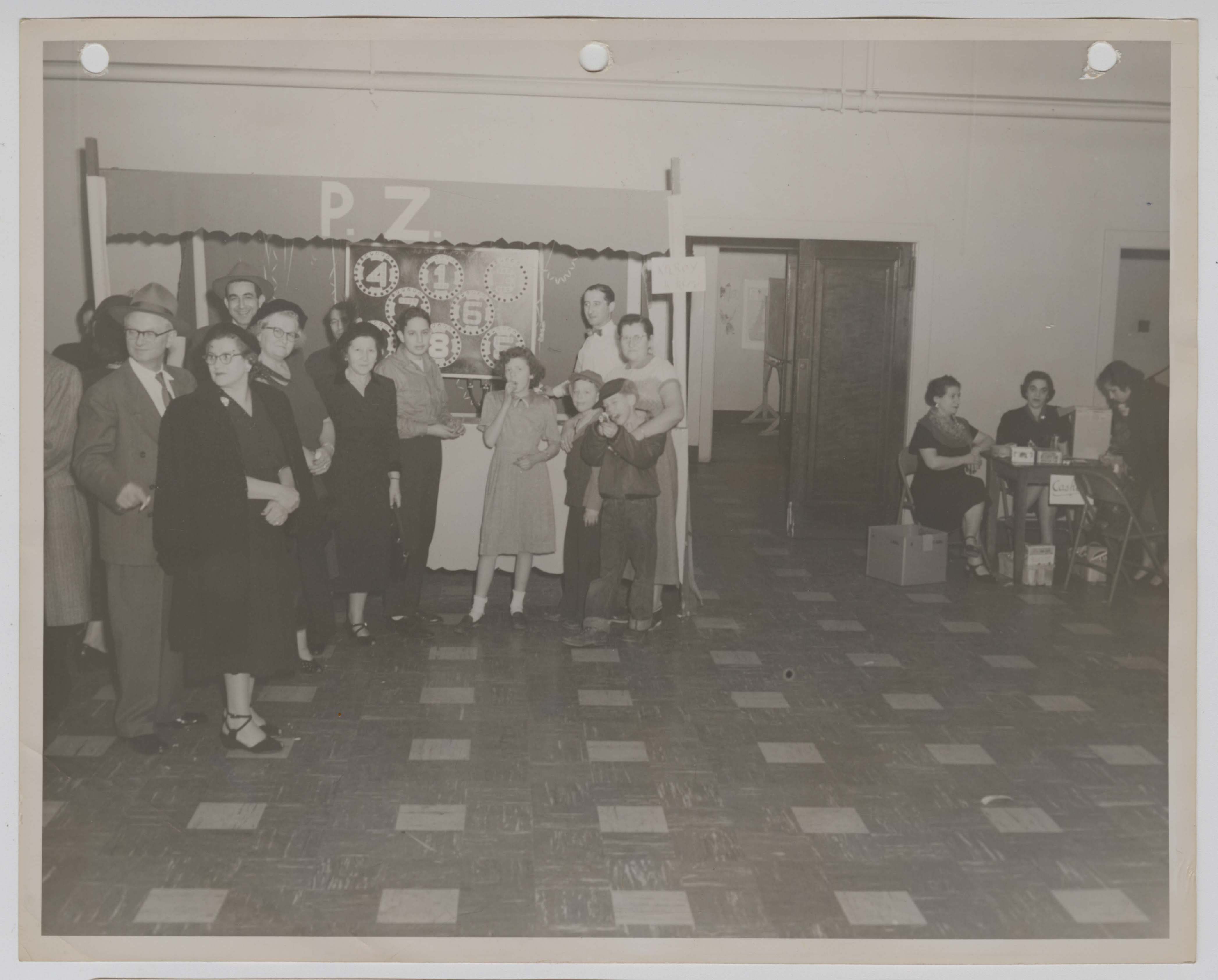 Black and white photograph of an unidentified Poale Zedeck Men’s Club event in the social hall of Congregation Poale Zedeck in Squirrel Hill.