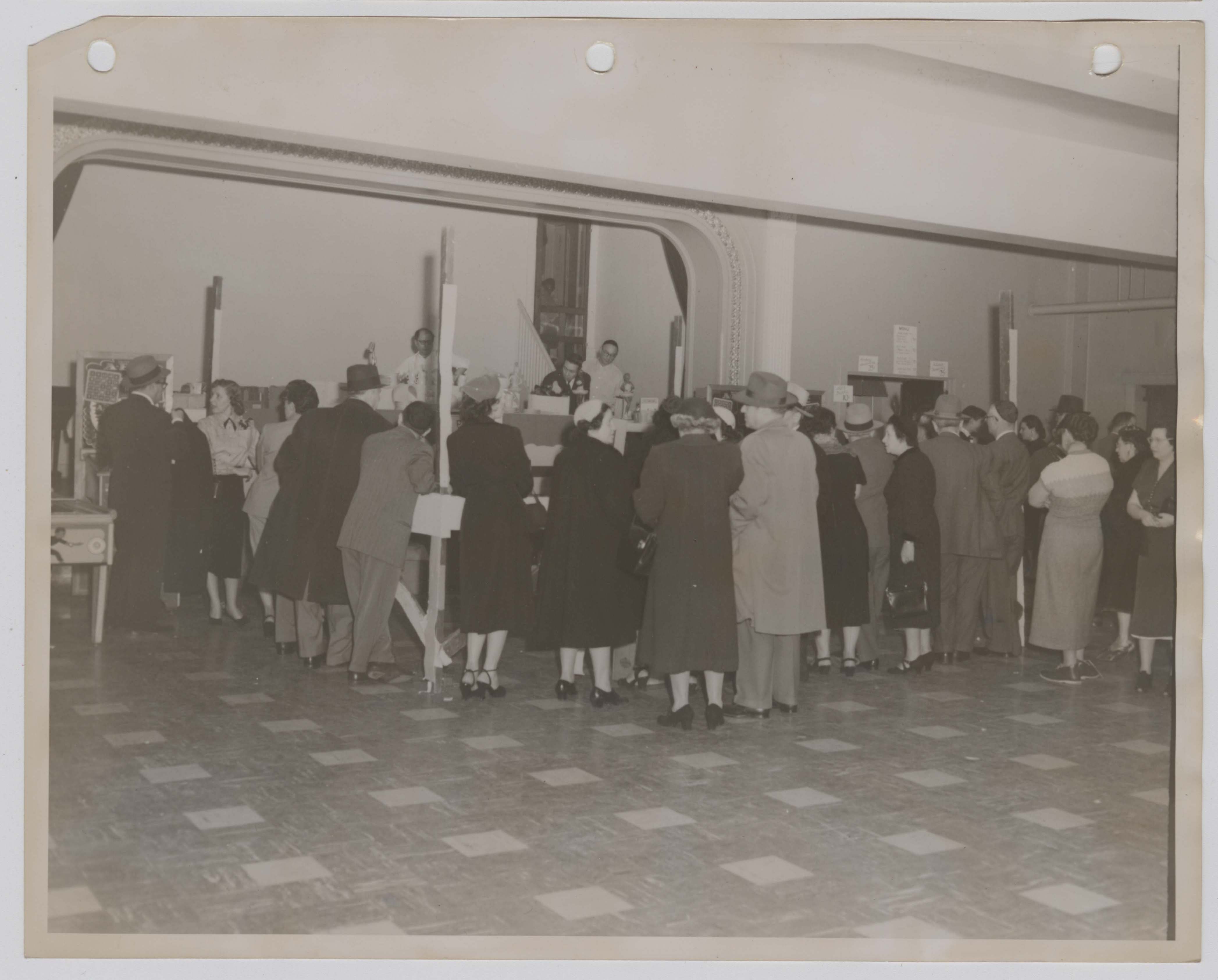 Black and white photograph of an unidentified Poale Zedeck Men’s Club event in the social hall of Congregation Poale Zedeck in Squirrel Hill.
