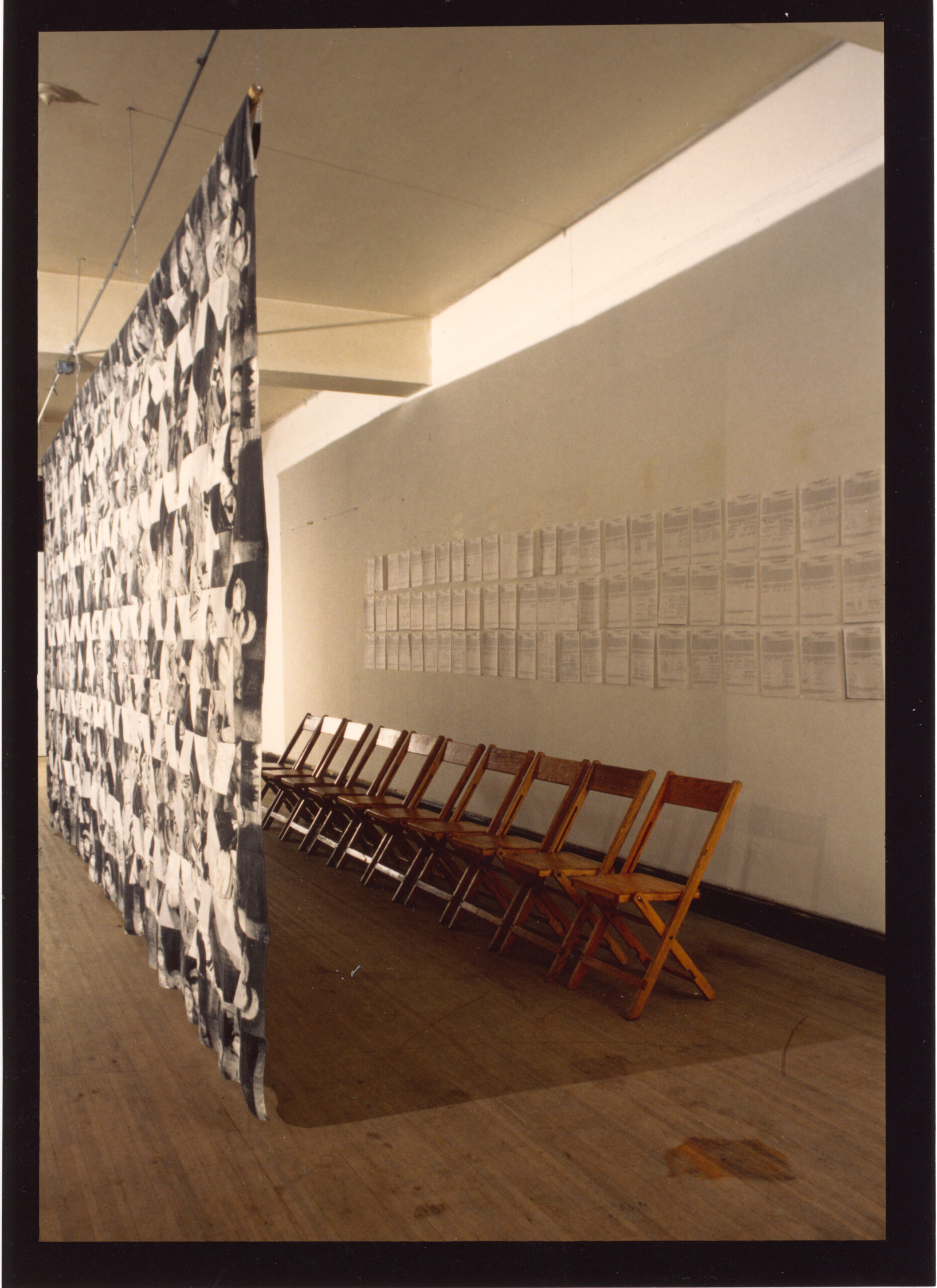 Color photograph of Leslie A. Golomb and Louise Silk’s quilted mechitzah with chairs behind it. Date 1995 Identifier MSS_1326_B001_F043_I02 Collection Louise Silk Papers and Photographs [MSS 1326] Source Rauh Jewish Archives at the Heinz History Center
