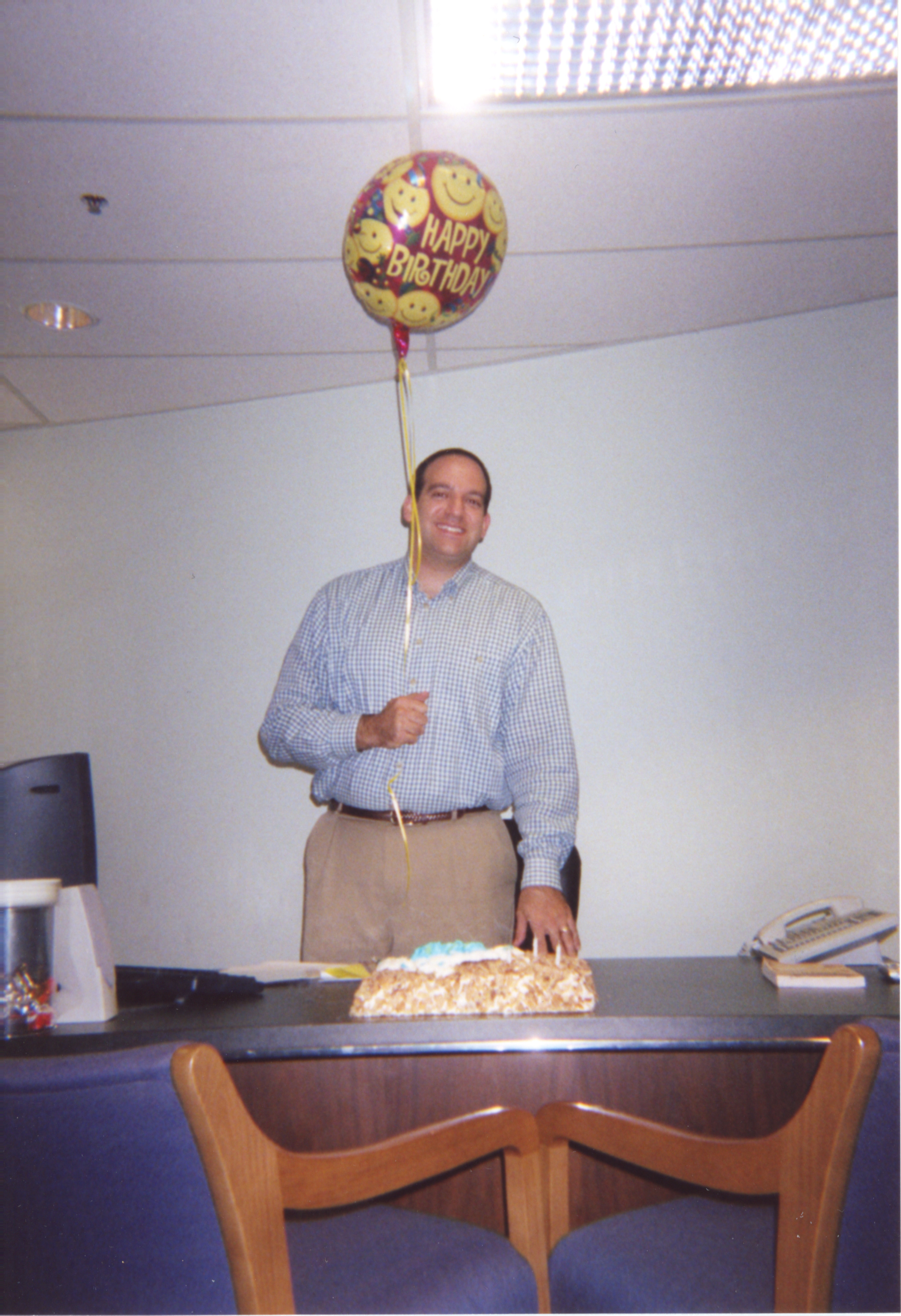 Color photograph of Rabbi Alex Greenbaum posing with a “Happy Birthday Balloon”.