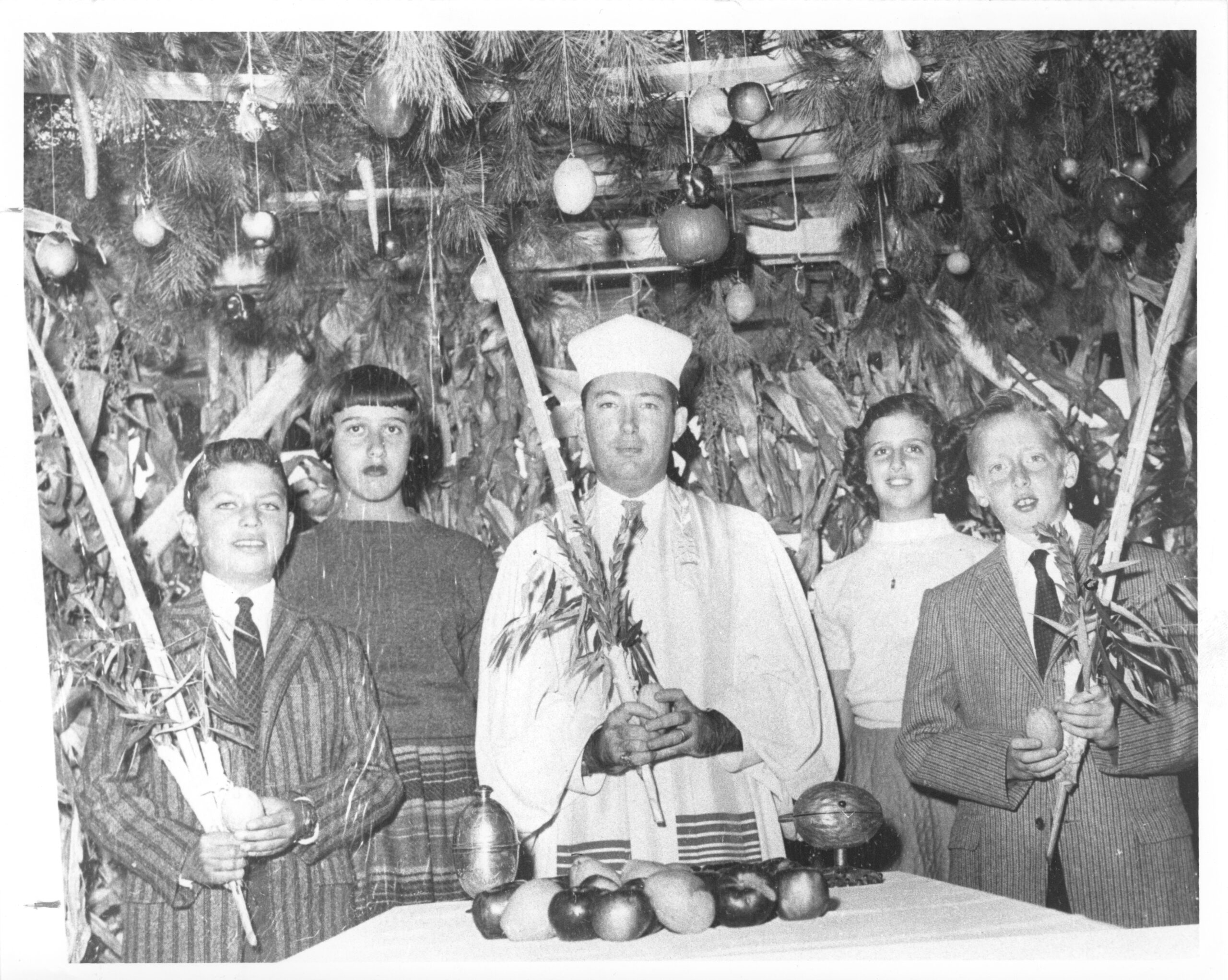 Black and white photograph of (center) Rabbi Daniel Lowy with religious school children under the congregation’s sukkah. Included in the photograph is (from left to right) marvin Grossman, Marsha caplan, Barbara Caplan, and Charles Bloom.
