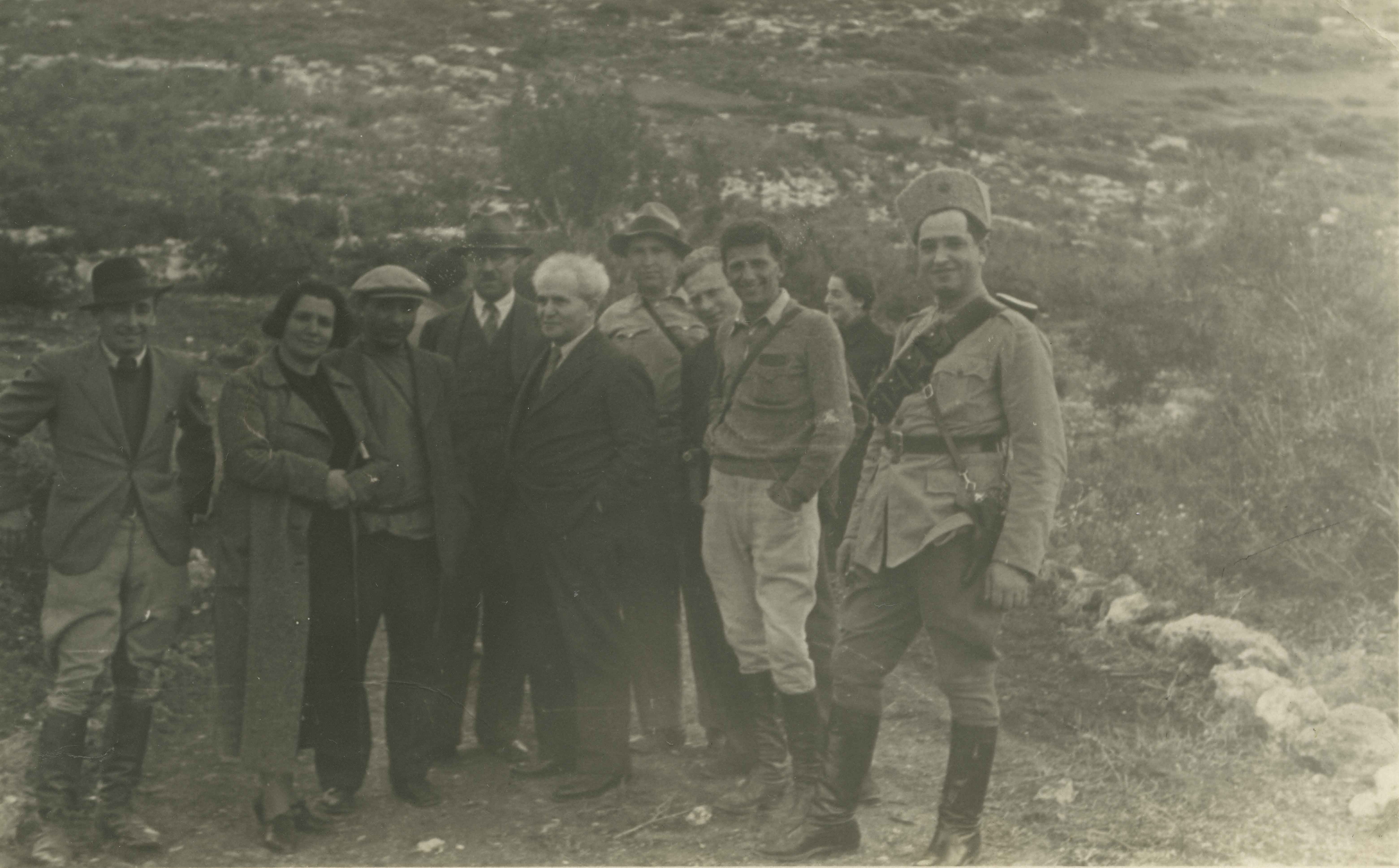 Ralph Atlas (standing far left) met with David Ben-Gurion (center), then the head of the Jewish Agency for Palestine and later the Prime Minister of Israel, at the frontier settlement of Hanita, near the Lebanese border.