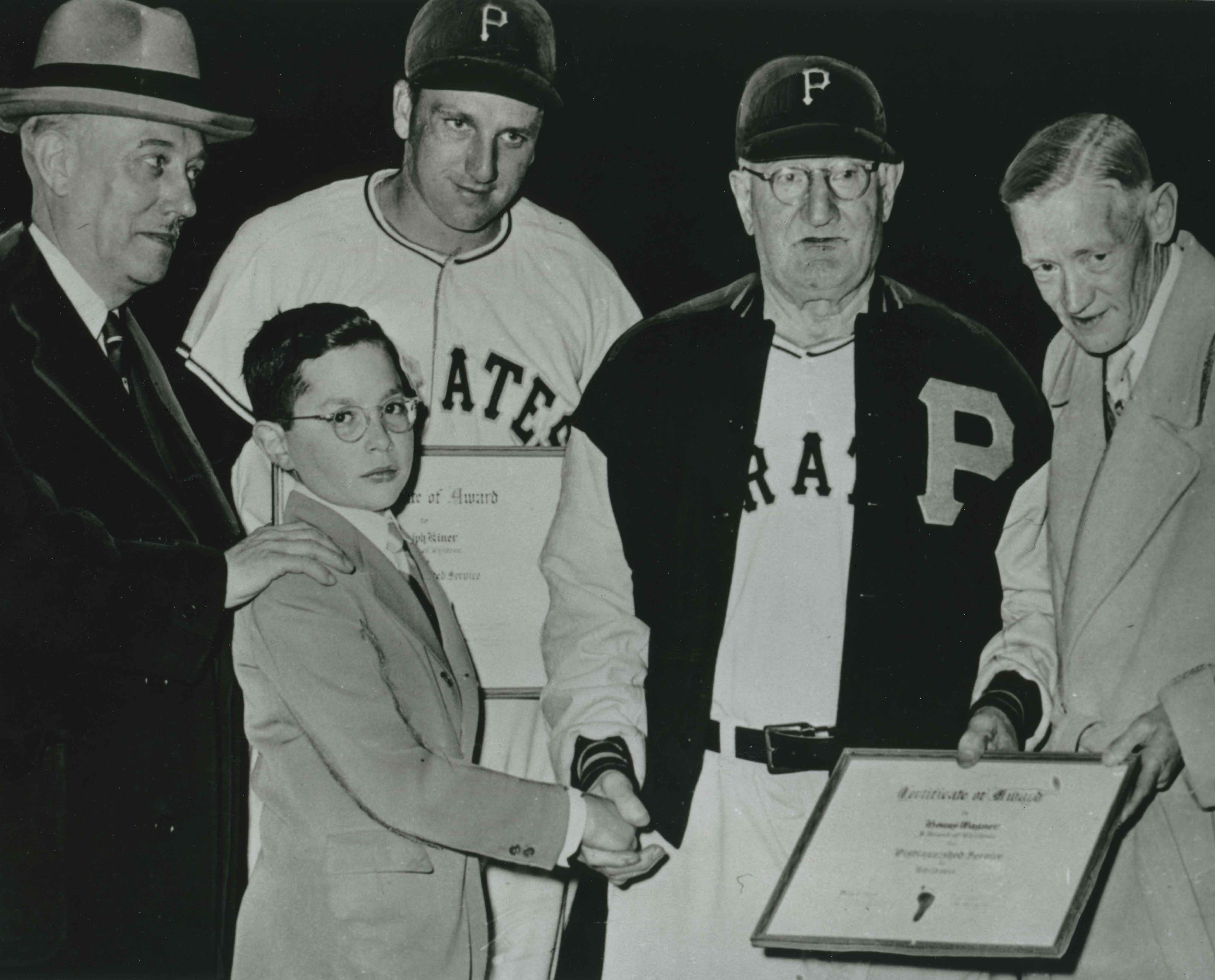 Richard E. Rauh meeting Pittsburgh Pirates legends Honus Wagner (right) and Ralph Kiner (left), as well as Judge Gustav Schramm and Pirates’ announcer Rosey (Albert Kennedy) Rowswell.
