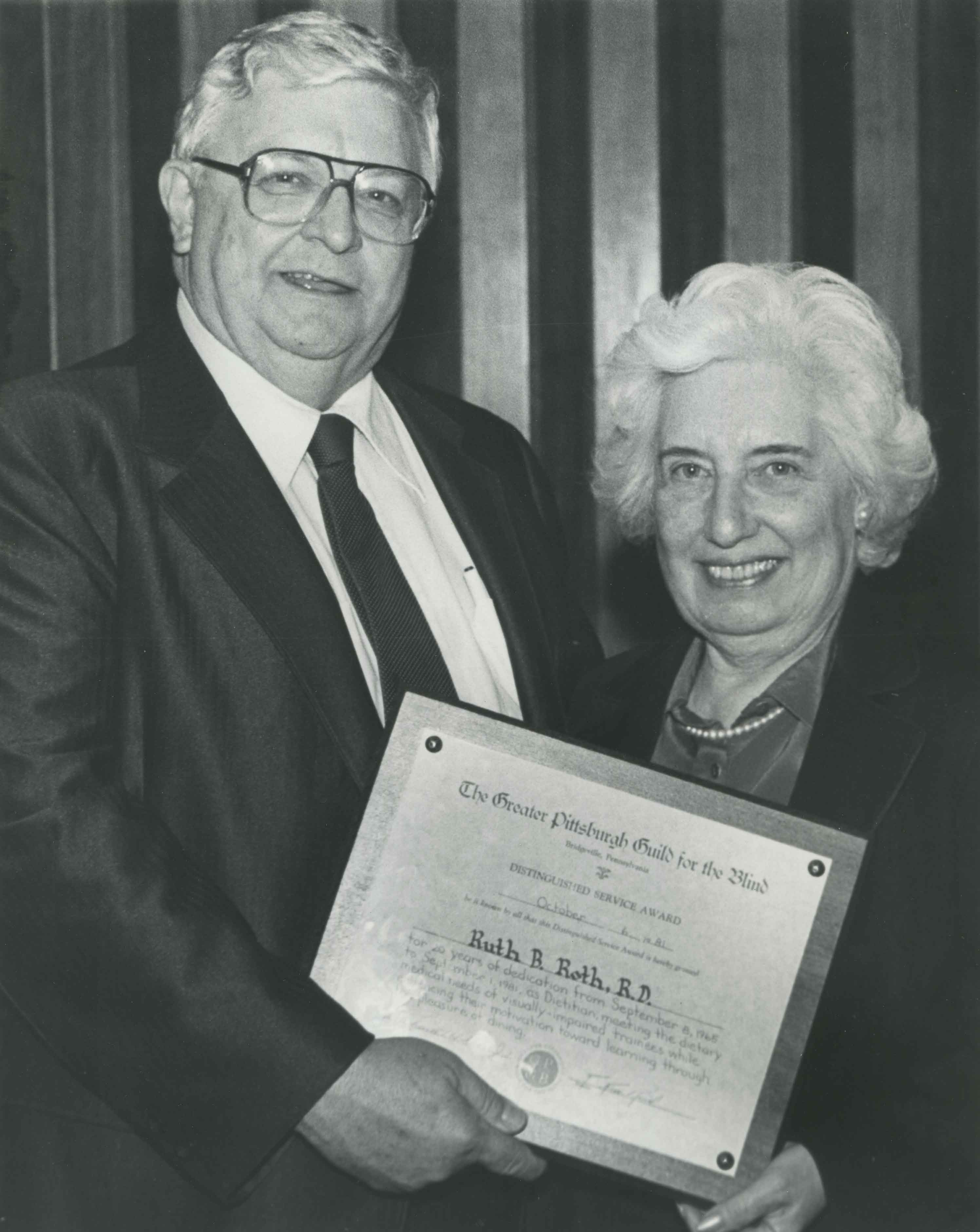 Ruth Buchman Roth received a distinguished service award for her work with the Greater Pittsburgh Guild for the Blind. Date 1979 Identifier MSQ357_I12 Collection Buchman Family Photographs Source Rauh Jewish Archives at the Heinz History Center Family The Buchman Family : View Family Member