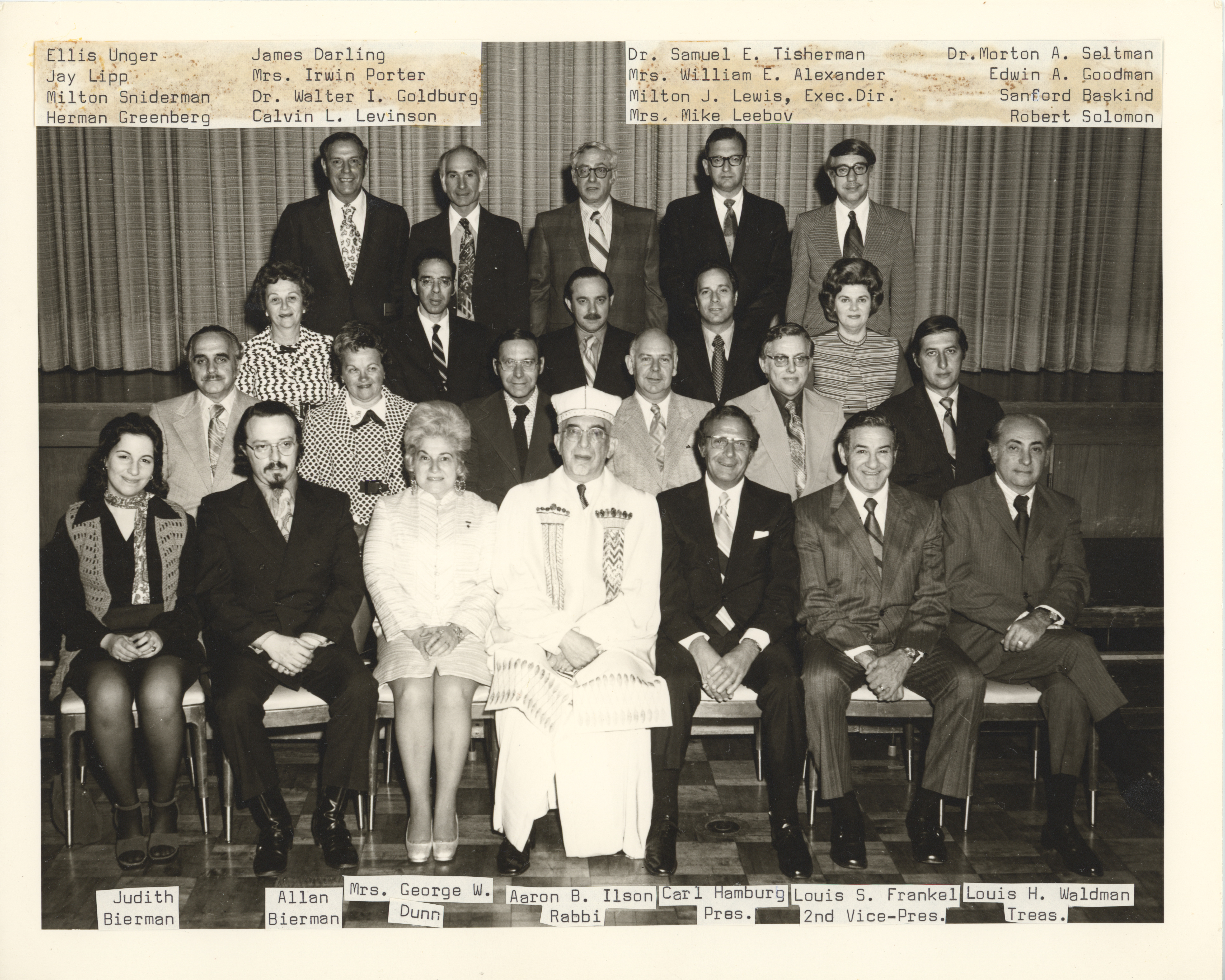 Black and white photograph of Temple Sinai’s board of directors. (Fourth row standing left to right) Ellis Unger; Jay Lipp; Milton Sniderman; James Darling. (Third row sitting left to right) Mrs. Irwin Porter; Dr. Walter I. Goldburg; Calvin L. Levinson; Dr. Samuel E. Tisherman; Mrs. William E. Alexander. (Second row sitting left to right) Milton J. Lewis; Mrs. Mike Leeboy; Dr. Morton A. Saltman; Edwin A. Goodman; Sanford Baskind; Robert Solomon. (First row sitting left to right) Judith Blerman; Alan Bierman; Mrs. George W. Dunn; Rabbi Aaron B. Ilson; Carl Hamburg; Louis S. Frankel; Louis H. Waldman.