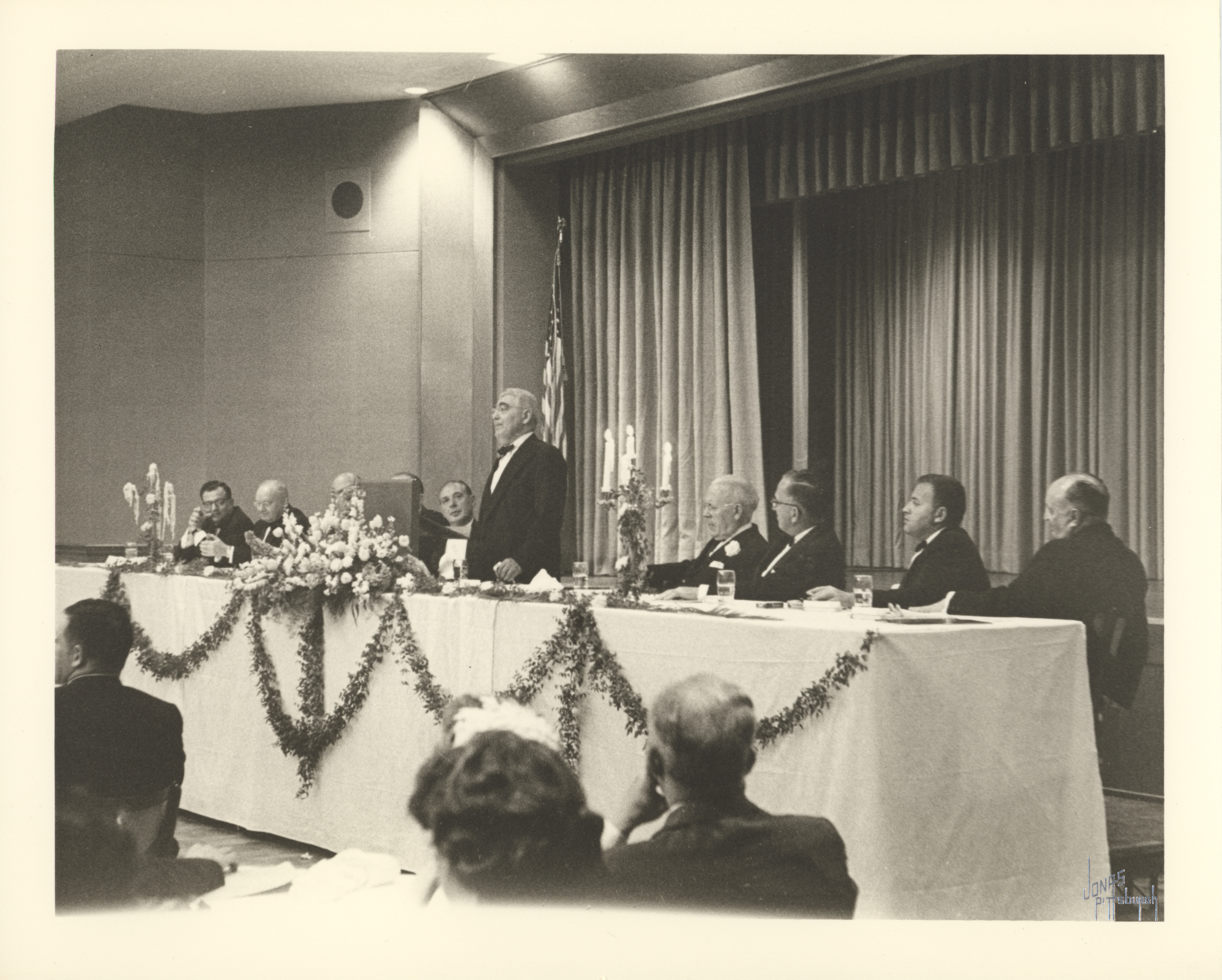 Black and white photograph of Rabbi Solomon Freehof speaking at Temple Sinai’s dedication dinner in celebration of the newly constructed Falk Auditorium and religious school.