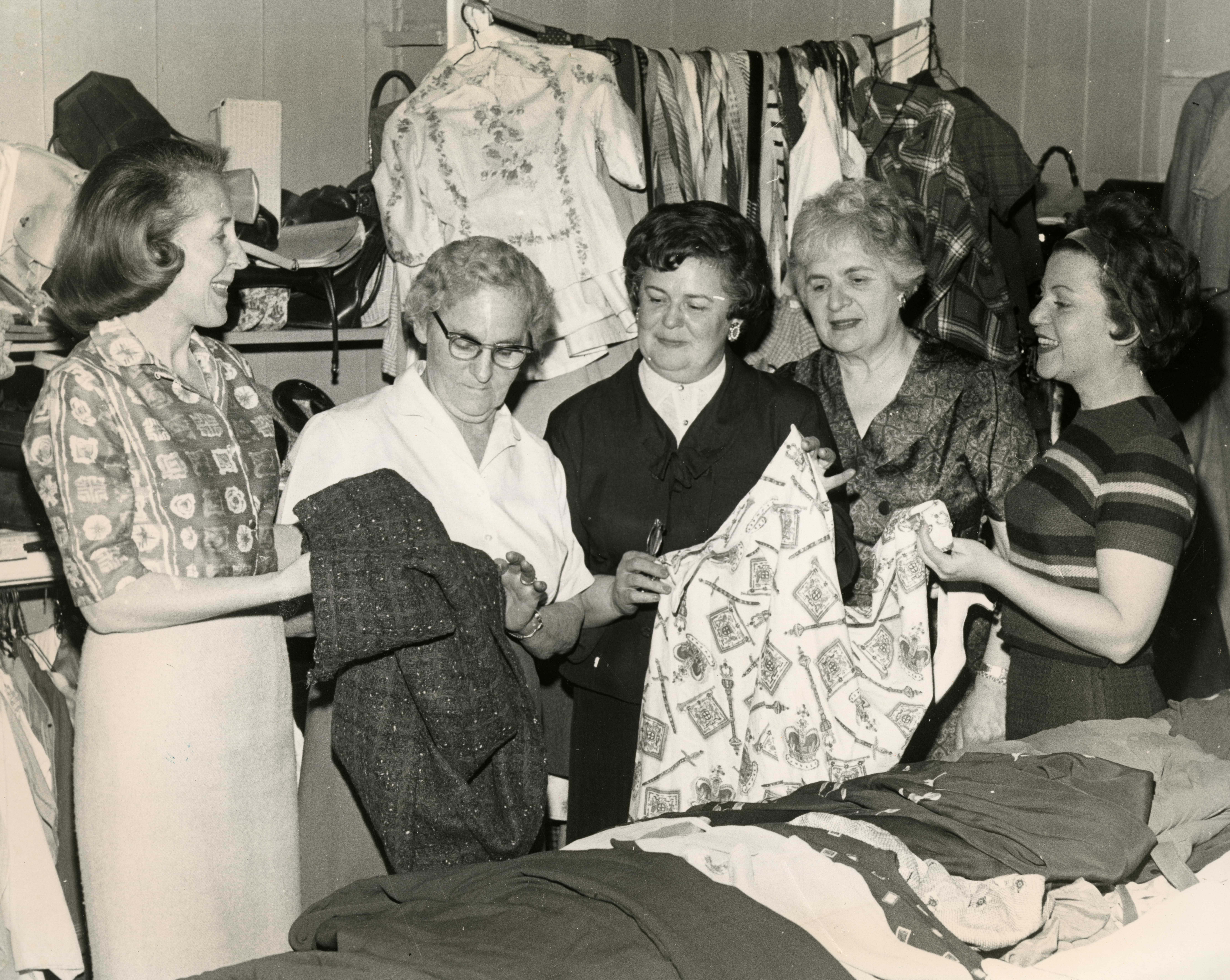 Temple Beth Israel Sisterhood members (from right to left) Natalie Jubelier, Rose Yanowitz, Rose Zatill and Mollie Shafran examining garments at their thrift shop.
