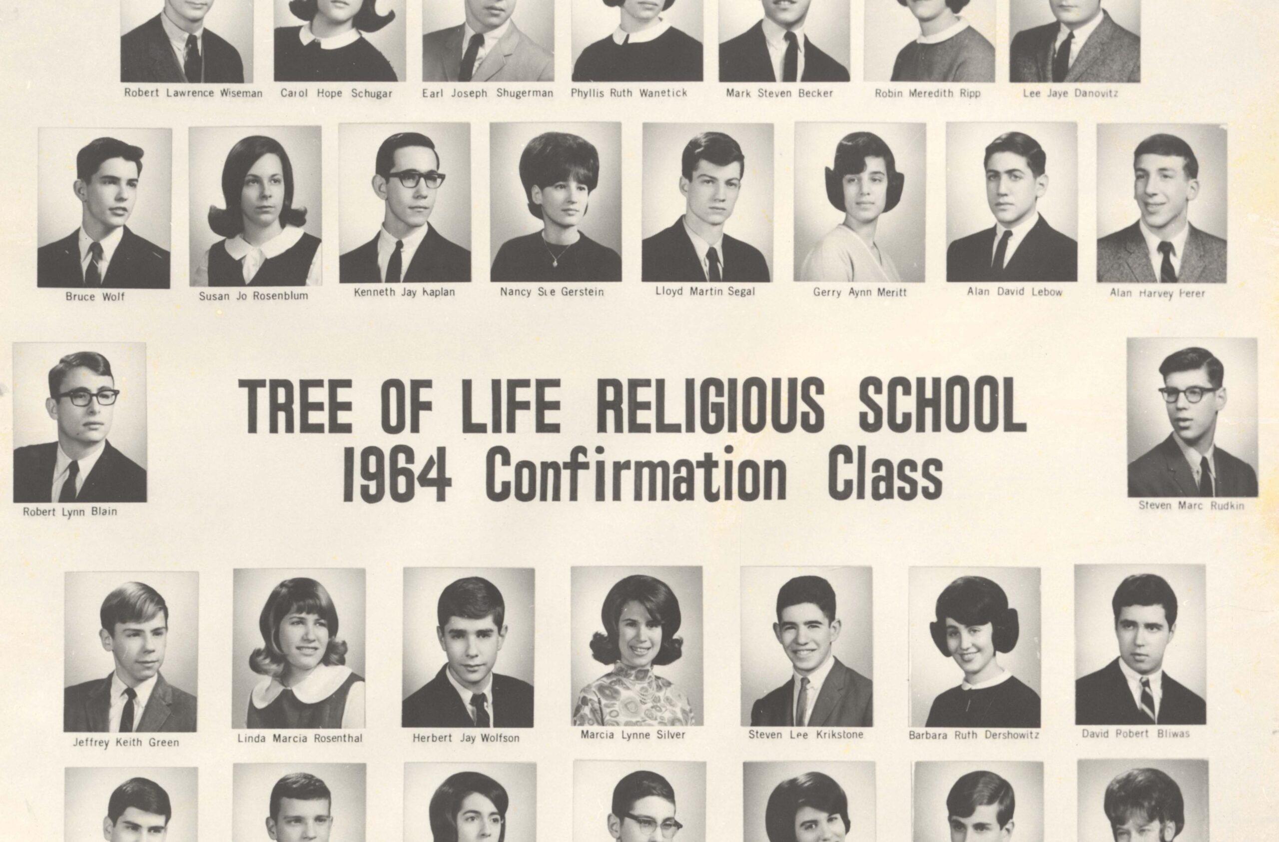 Photograph of the 1964 confirmation class of Tree of Life Congregation of Pittsburgh. Pictured: Robert Lawrence Wiseman, Carol Hope Schugar, Earl Joseph Shugerman, Phyllis Ruth Wanetick, Mark Steven Becker, Robin Meredith Ripp, Lee Jaye Danovitz, Bruce Wolf, Susan Jo Rosenblum, Kenneth Jay Kaplan, Nancy Sue Gerstein, Lloyd Martin Segal, Gerry Ann Meritt, Alan David Lebow, Alan Harvey Perer, Robert Lynn Blain, Steven Marc Rudkin, Jeffrey Keith Green, Linda Marcia Rosenthal, Herbert Jay Wolfson, Marcia Lynne Silver, Steven Lee Krikstone, Barbara Ruth Dershowitz, David Robert Bliwas, Stephen Gurney Fisher, Marc Abraham Dinkin, Beverly Dee Lipscher, David Paul Dobkin, Jeanne Lyn Katz, David Stuart Sobel, and Marsha Gail Markovitz.