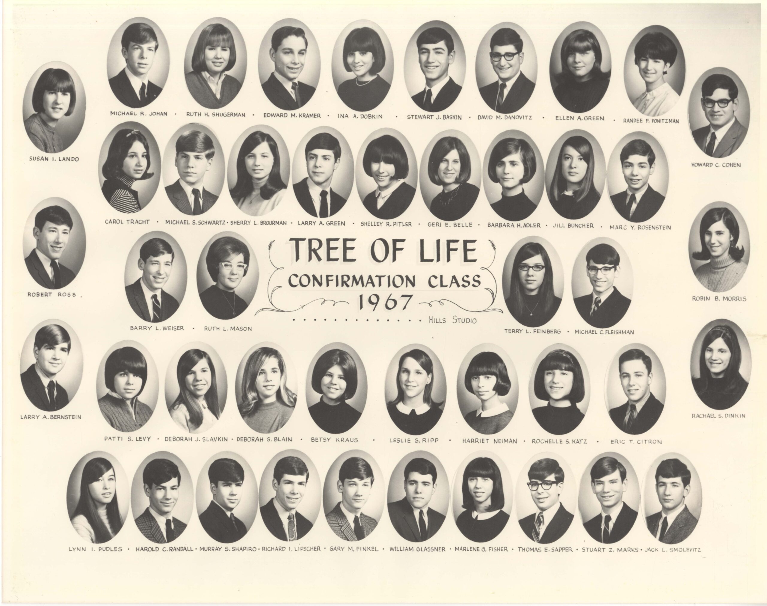 Photograph of the 1967 confirmation class of Tree of Life Congregation of Pittsburgh. Pictured: Susan I. Lando, Michael R. Jordan, Ruth H. Shugerman, Edward M. Kramer, Ina A. Dobkin, Stewart J. Baskin, David M. Danovitz, Ellen A. Green, Randee F. Ponitzman, Howard C. Cohen, Carol Tracht, Michael S. Schwartz, Sherry L. Brourman, Larry A. Green, Shelley R. Pitler, Geri E. Belle, Barbara H. Adler, Jill Buncher, Marc Y. Rosenstein, Robert Ross, Barry L. Weiser, Ruth L. Mason, Terry L. Feinberg, Michael C. Fleishman, Robin B. Morris, Larry A. Bergstein, Patti S. Levy, Deborah J. Slavkin, Deborah S. Blain, Betsy Kraus, Leslie S. Ripp, Harriet Neiman, Rochelle S. Katz, Eric T. Citron, Rachel S. Dinkin, Lynn I. Pudles, Harold C. Randall, Murray S. Shapiro, Richard I. Lipscher, Gary M. Finkel, William Glassner, Marlene G. Fisher, Thomas E. Sapper, Stuart Z. Marks, and Jack L. Smolevitz.
