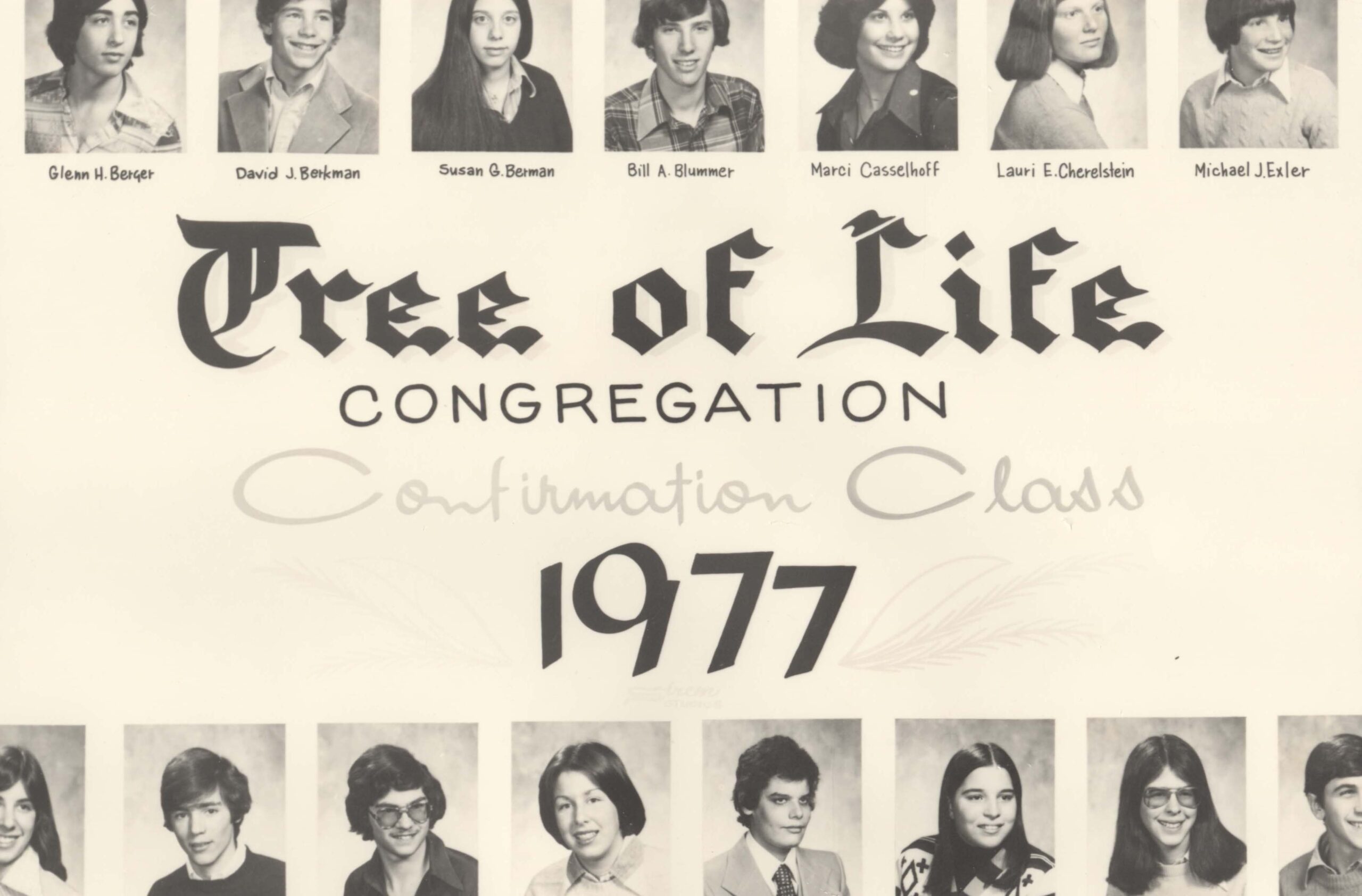 Photograph of the 1977 confirmation class of Tree of Life Congregation of Pittsburgh. Pictured: Lynn S. Aranson, Glenn H. Berger, David J. Berkman, Susan G. Berman, Bill A. Blummer, Marci Casselhof, Lauri E. Cherelstein, Michael J. Exler, Robert J. Harris, Miles J. Kirshner, Amy J. Klein, Lori E. Kubitz, Gail S. Kuller, Andrea L. Kurtz, Steven S. Marks, Mark B. Morrow, Sharon Morton, Gregg D. Neuman, Pamela S. Pochapin, Debra A. Porter, Randall L. Rose, Andrew R. Schachter, Neal R. Segal, Jody B. Shapiro, Betsy A. Shufler, Paul Sikov, Randi S. Silverman, Michael Simon, James L. Young, illegible.