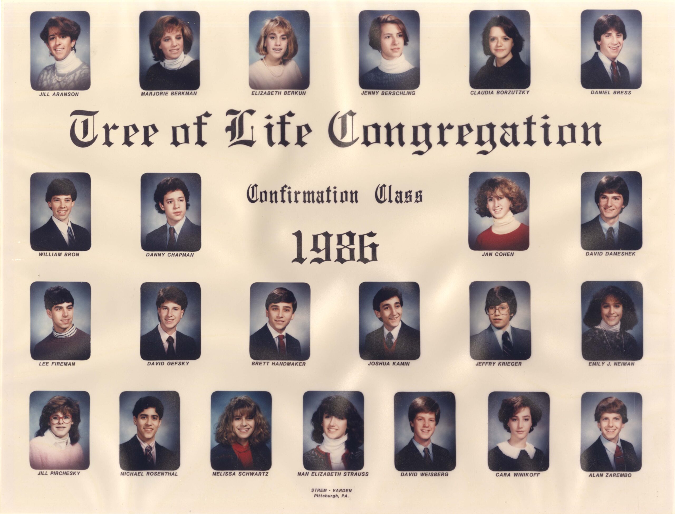 Photograph of the 1986 confirmation class of Tree of Life Congregation of Pittsburgh. Pictured: Jill Aranson, Marjorie Berkman, Elizabeth Berkun, Jenny Berschling, Claudia Borzutsky, Daniel Bress, William Bron, Danny Chapman, Jan Cohen, David Dameshek, Lee Fireman, David Gefsky, Brett Handmaker, Joshua Kamin, Jeffry Krieger, Emily J. Neiman, Jill Pirchesky, Michael Rosenthal, Melissa Schwartz, Nan Elizabeth Strauss, David Weisberg, Cara Winikoff, Alan Zarembo.