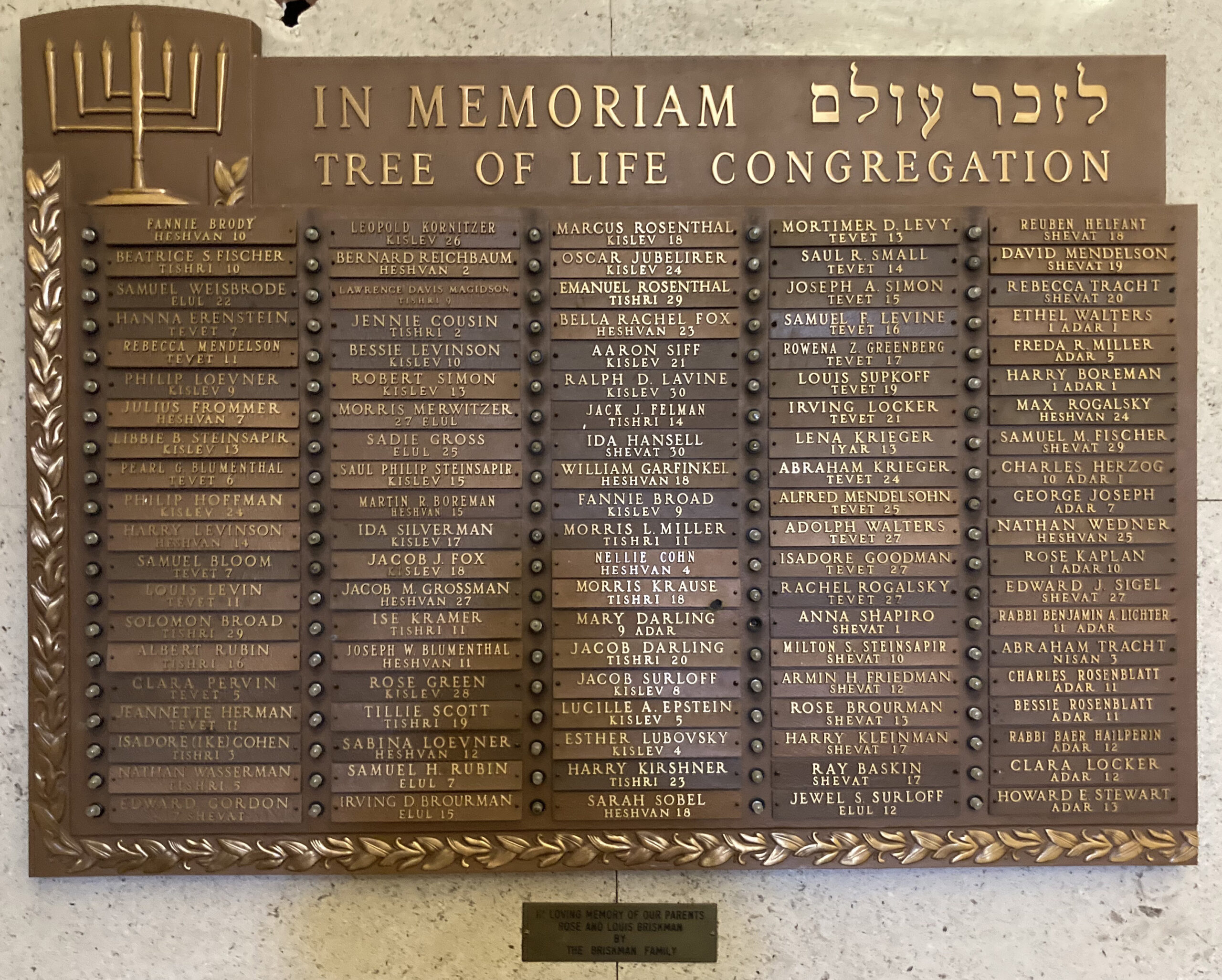 Memorial board from the lobby of the Pervin Sanctuary of Tree of Life Congregation in Pittsburgh. Surnames listed: Baskin, Bloom, Blumenthal, Boreman, Broad, Brody, Brourman, Cohen, Cohn, Cousin, Davis, Darling, Erenstein, Epstein, Felman, Fischer, Fox, Friedman, Frommer, Garfinkel, Goodman, Gordon, Green, Greenberg, Gross, Grossman, Hailperin, Hansell, Helfant, Herman, Herzog, Hoffman, Joseph, Jubelirer, Kaplan, Kirshner, Kleinman, Kornitzer, Kramer, Krause, Krieger, Lavine, Levin, Levine, Levinson, Levy, Lichter, Locker, Loevner, Lubovsky, Magidson, Mendelsohn, Mendelson, Merwitzer, Miller, Pervin, Reichbaum, Rogalsky, Rosenblatt, Rosenthal, Rubin, Scott, Shapiro, Siff, Sigel, Silverman, Simon, Small, Sobel, Steinsapir, Stewart, Supkoff, Surloff, Tracht, Walters, Wasserman, Wedner, and Weisbrode. Dedicatory plaque reads “Loving memory of our parents Rose and Louis Briskman by the Briskman Family.” Transcribed by Jon Halpern.