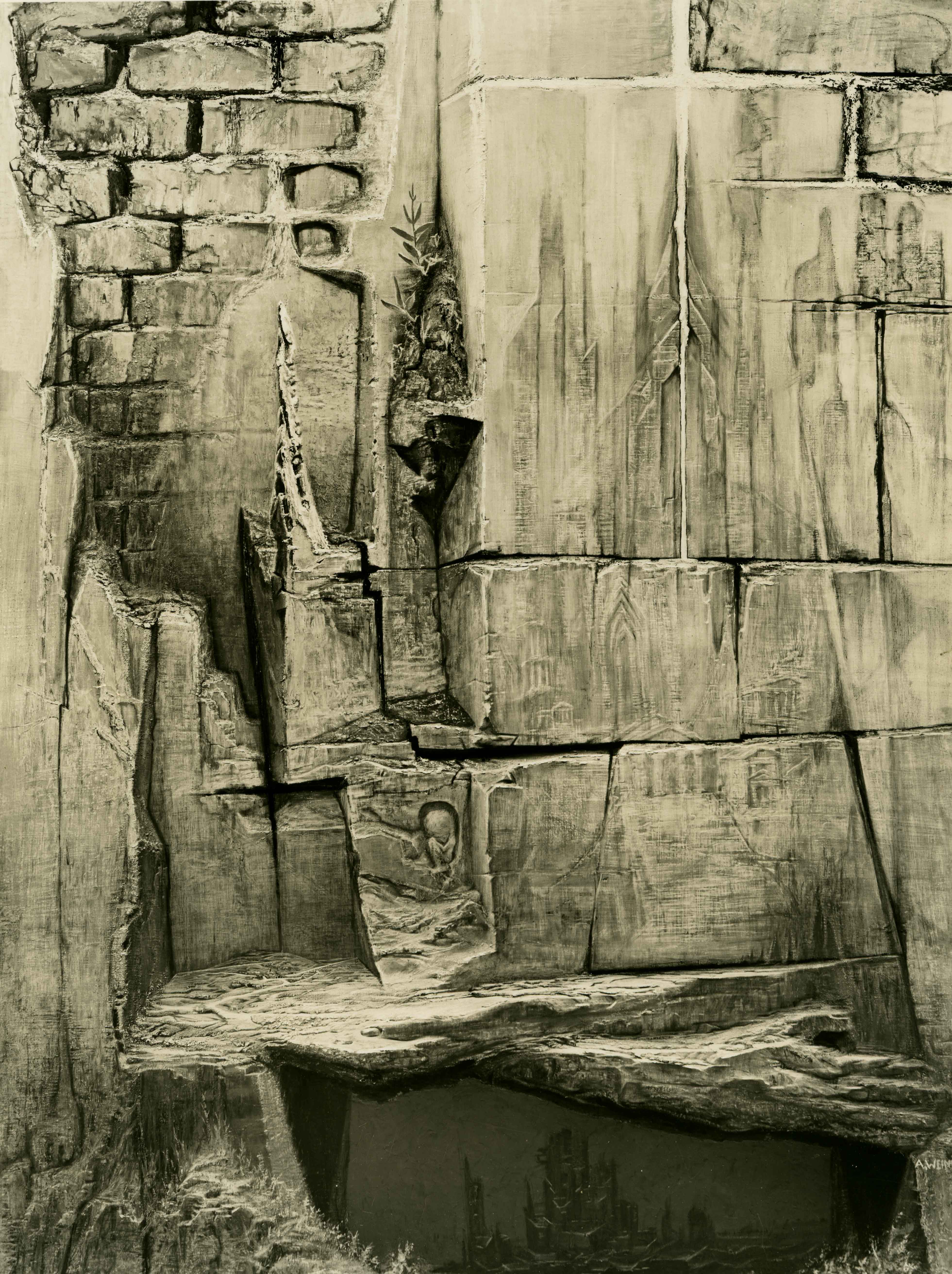 Abe Weiner gradually developed a distinctive surrealist style, starting with “The Wall.” Date 1950 Identifier MSS582_B002_F006_I01 Collection Abe Weiner Papers and Photographs Source Rauh Jewish Archives at the Heinz History Center Family The Weiner Family : View Family Member
