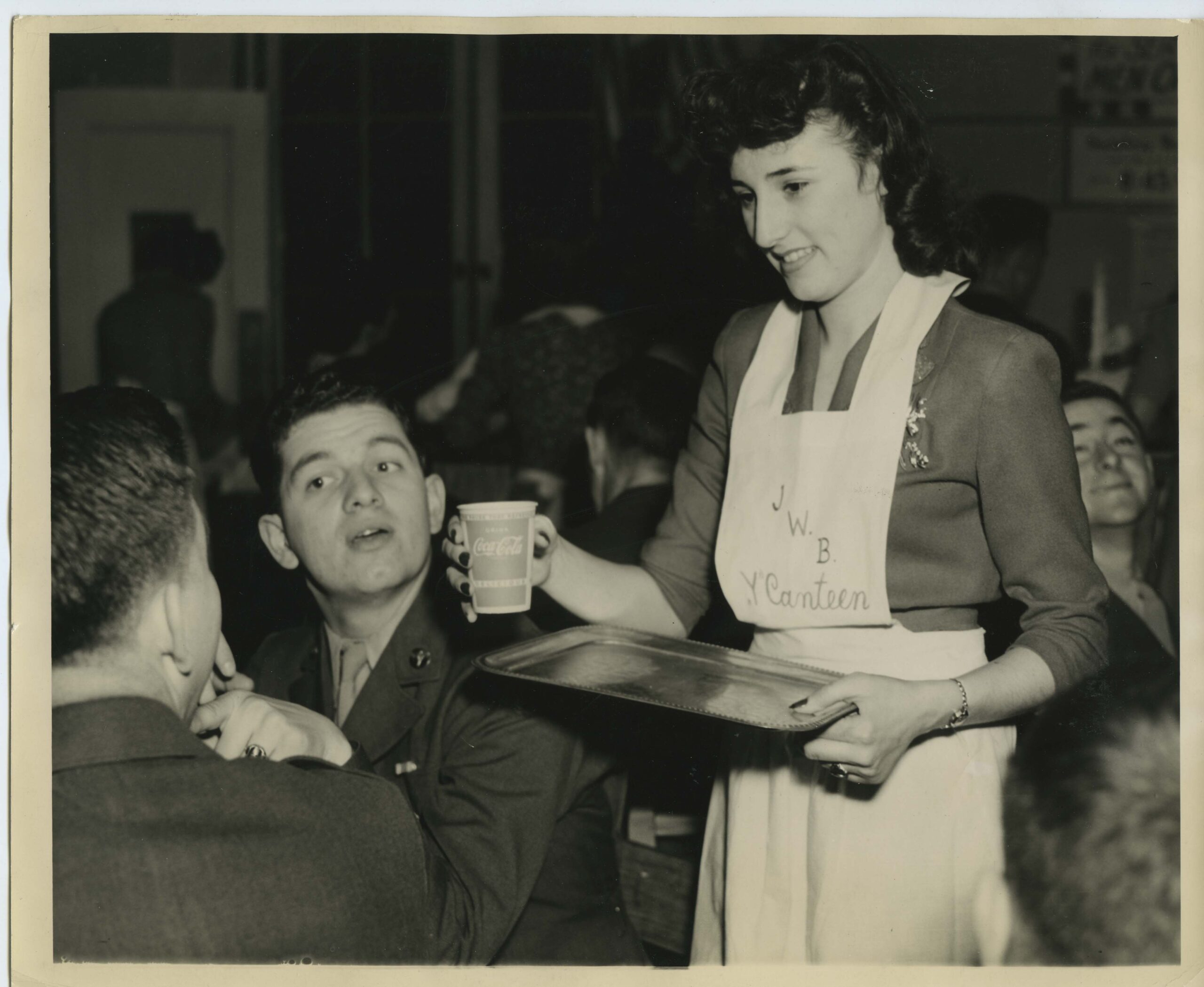 Black and white photograph showing hostess in a Y Canteen apron handing a cup to a serviceman. Date c.1943 Identifier MSP389_B075_F008_I01 Collection Jewish Community Center of Greater Pittsburgh Photographs [MSP 389] Source Rauh Jewish Archives at the Heinz History Center